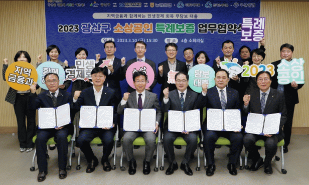 광산구는 10일 구청에서 광주신용보증재단, 농협은행, 서광주새마을금고, 한마음새마을금고, 우산신협과 ‘2023년 소상공인 특례보증 대출 업무협약’을 체결했다.