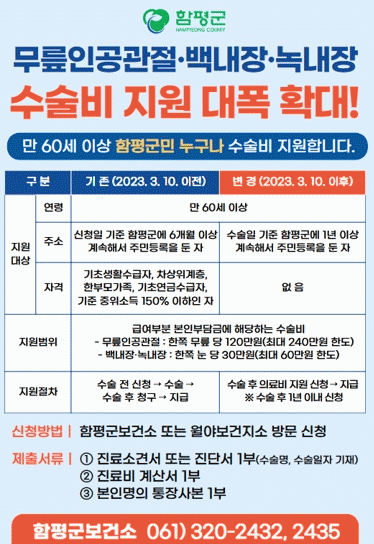 먼저, 소득요건을 없애고 만 60세 이상 함평 군민이라면 누구나 혜택을 받을 수 있도록 변경했다. 단, 수술일 기준 1년 이상 계속해서 함평군에 주소를 두어야 한다.