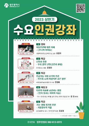 이어 ▲4월 19일 ‘우리 곁의 난민’(문경란 인권플러스 대표) ▲5월 10일 ‘인간과 인공지능(AI)의 바람직한 공존 방안’(전창배 국제인권지능윤리협회 이사장) ▲5월 31일 ‘북토크 알지 못하는 아이의 죽음으로 이야기하는 타인의 아픔에 공감하는 방법’(은유 작가) ▲6월 21일 ‘기후·생태 위기와 인권’(조효제 성공회대학교 교수) 등 순으로 선보인다.