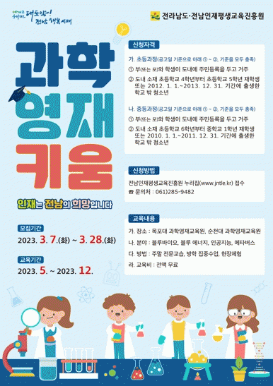 고석규 전남인재평생교육진흥원장은 “지난해 처음 시작한 과학영재키움 사업은 학부모와 학생의 교육 만족도가 높아 올해는 20명 늘어난 100명으로 확대 운영한다”며 “과학에 관심 있는 청소년의 많은 참여 바란다”고 말했다.