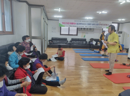 이날 김규만 원장은 진료 시작 전에 먼저 건강강좌를 갖고, 간단한 골반교정 운동 방법과 함께 청력 감퇴 예방 ‘귀 후비기 운동’, 백내장 ? 녹내장 예방 ‘눈 부비기 운동’ 입마름 및 치매 예방 ‘합죽이 합구(合口) 테이핑’ 등 어르신이 손쉽게 실천할 수 있는 다양한 방법에 대해 교육했다.