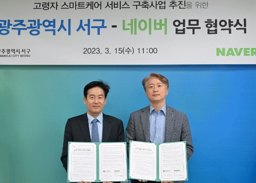 이날 협약식에는 김이강 서구청장과 나군호 네이버 헬스케어연구소 소장이 참석해 인공지능(AI)돌봄 시스템인 네이버 ‘클로바 케어콜’을 활용한 고령자 안부 확인 시범서비스 공동 추진을 약속했다.