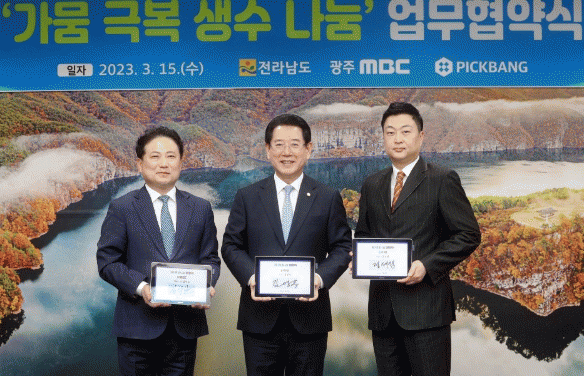 협약식에는 김영록 전남도지사, 김낙곤 광주MBC 대표이사 사장, 정태원 ㈜픽뱅 대표이사가 참석해 물 부족으로 어려운 지역민을 위한 ‘100만 생수 기부 챌린지’를 공동 추진키로 했다.