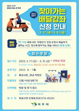 접수가 완료되면 4월부터 7월까지 상반기 배달강좌를 운영할 예정이며, 하반기 배달강좌는 7월 접수 후 8월부터 12월까지 운영할 예정이다. 기타 사항은 목포시청 인재육성과으로 문의하면 된다.