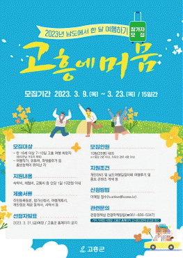 참가 신청기간은 3월 23일까지이며, 공고일 기준 만 18세 이상 광주·전남지역 외 거주자로 고흥 여행을 희망하는 사람이라면 누구나 신청할 수 있다. 모집 인원은 10팀(25명) 내외이며, 팀별 구성인원은 일반인의 경우 2명 이내, 가족의 경우 4명 이내이다.
