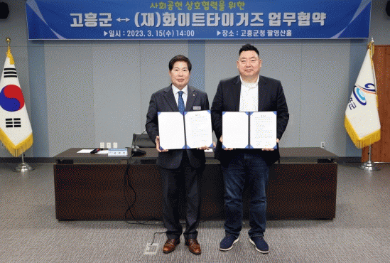 이날 화이트타이거즈는 협약 후 고흥군 축산농가를 위해 방호복 2,500벌(5천만원 상당)을 기증하고 군민 보건증진과 지역 홍보, 사회적 약자를 위한 사회공헌 활동을 약속했다.