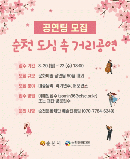 자세한 내용은 순천문화재단 누리집 공지사항에서 확인하거나 예술진흥팀으로 문의하면 된다.