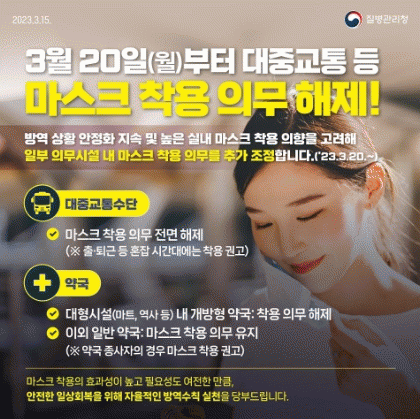 이는 지난 1월 30일 실내 마스크 착용 의무를 조정한 이후 하루 평균 확진자는 38%, 신규 위중증 환자는 55% 줄고, 신규 변이도 발생하지 않는 등 방역 상황이 안정적인 것으로 판단한 것에 따른 것이다.