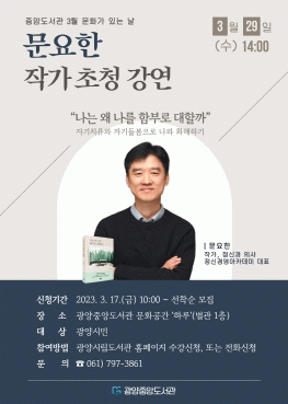 강연은 광양시민 누구나 참여 가능하며, 참여를 원하는 시민은 17일 오전 10시부터 광양시립도서관 독서문화행사 수강신청 게시판에서 온라인 또는 전화로 신청하면 된다.