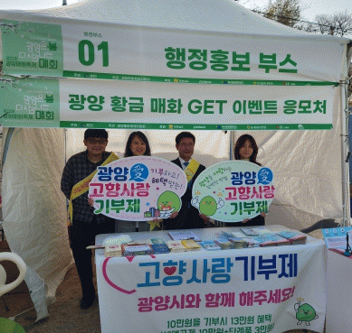 광양시는 매화축제를 시작으로 25일부터 이틀간 옥룡사지 동백숲 일원에서 실시되는 제6회 광양 천년 동백축제 등 지역축제에 홍보부스를 운영해 관광객과 지역 주민을 대상으로 고향사랑기부제도 홍보를 지속적으로 추진할 계획이다.