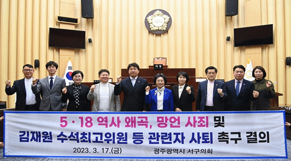 서구의회 의원들은 결의안을 통해 “집권여당 수석최고위원과 대통령이 임명한 진실화해위원장의 발언은 개인 의견으로 치부할 수 없다”며 ▲5.18역사를 왜곡하고 광주시민을 조롱한 수석최고위원과 진실화해위원장의 망언에 대한 국민의힘 측의 즉각 사죄 ▲윤석열 대통령의 공약인 5.18정신의 헌법전문수록 즉각 이행 ▲김재원 수석최고위원의 사퇴와 김광동 위원장의 해임을 촉구했다.