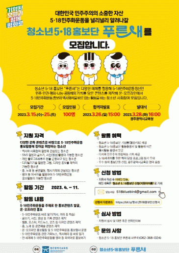 시교육청 세계민주시민교육과 고인자 과장은 “‘청소년 5·18 홍보단 푸른새’가 청소년들의 눈높이에 맞춘 5·18민주화운동의 정신과 가치를 홍보하고, 오월 정신을 실천하는 계기가 될 것”이라며 “다양한 역량을 가진 청소년들의 많은 관심과 참여를 부탁드린다“고 밝혔다.