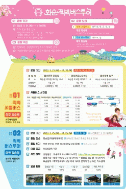 기존 사전예약제로 운영되는 ‘화순적벽 버스투어(화순읍 이용대체육관 출발)’는 3월 25일부터 11월 26일까지 매주 토, 일 운행한다. 탑승인원은 회당 60명(2대)이며, 이용요금은 1인당 10,000원이다.