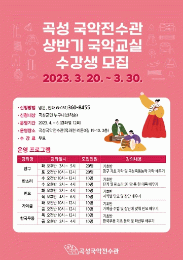 곡성국악전수관은 곡성군 옥과면 리문3길 19-10 아름드리나눔센터 3층에 위치해 있다. 국악교실 수강료는 무료이며, 수강 희망자는 오는 20일부터 30일까지 전화 또는 방문을 통해 신청할 수 있다.