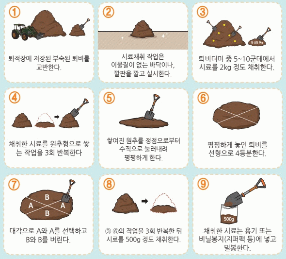부숙도 검사를 위한 퇴비 시료 채취 방법은 시료를 대표할 수 있는 5~6곳에서 채취 후 깨끗한 깔판에 옮겨 균일하게 혼합하고 원추 4분법에 따라 최종 500g 시료를 채취하면 된다.