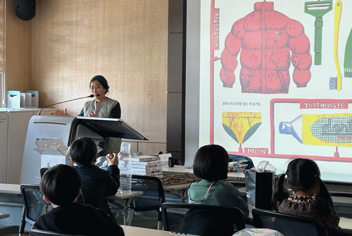 이날 김지형 작가와의 만남에서는 미세플라스틱에 대한 강연과 작가가 직접 들려주는 도슨트, 폐플라스틱을 활용한 모빌 만들기를 진행했다.