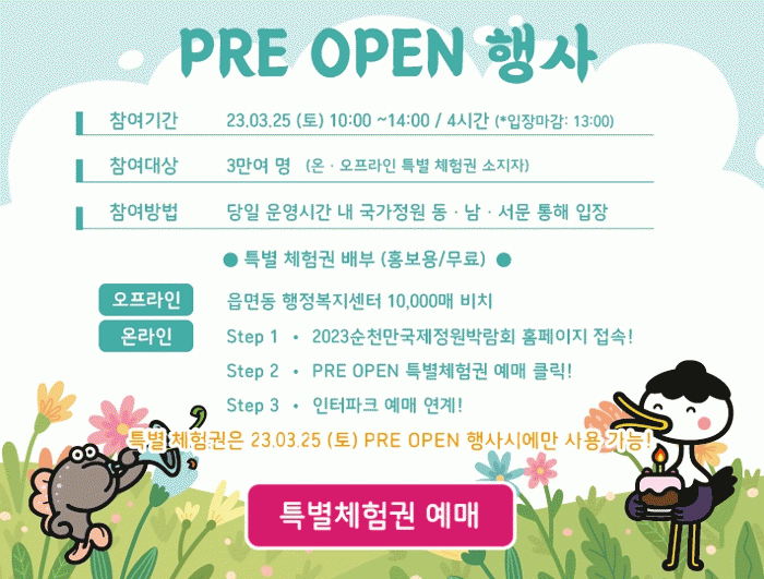 특별 체험권은 읍면동 행정복지센터 민원실(1만 매) 또는 2023순천만국제정원박람회 및 순천시청 누리집 프레오픈 행사 체험권 예매(2만 매)를 통해 누구나 제공 받을 수 있다.