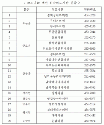아울러 동절기 추가접종이 종료됨에 따라 올해 하반기(10월~11월) 중 코로나19 예방접종을 시행하기 전까지 한시적인 축소이며 백신이 필요한 군민에게 최소한의 접근성을 제공하기 위하여 축소 유지되는 20개소 지정 위탁의료기관에서는 접종할 수 있다.