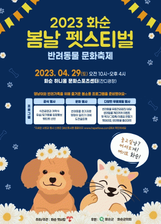 화순펫사랑 주관으로 오전 09시 30분에서 오후 16시까지 예정된 ‘화순 봄날 펫스티벌’은 반려동물 학대 등 사전 예방과 반려동물에 대한 인식 개선을 위해 프로그램을 알차게 준비했다.