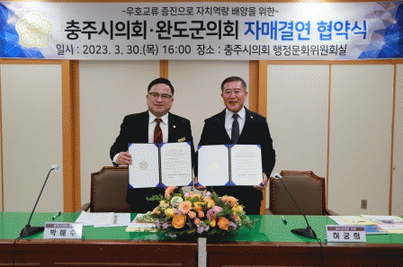 충주시의회 박해수 의장은 “완도군의회와 자매결연을 맺게 되어 매우 기쁘다”며“앞으로 진정한 지방자치 기반 조성을 위해 활발한 교류를 이어가는 훌륭한 동반자기 되길 기대한다”고 전했다.