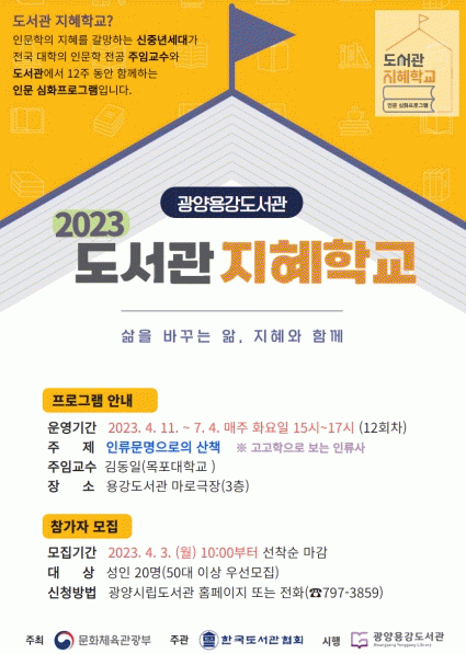 김미라 도서관운영과장은 “광양시립도서관에서는 지역주민의 인문학 수요를 위해 다양한 강좌와 문화행사를 제공하고 있다”며 “이번 용강도서관 지혜학교 사업의 인문학 강연에 중장년층 시민들이 많이 찾아주시길 바란다”고 말했다.