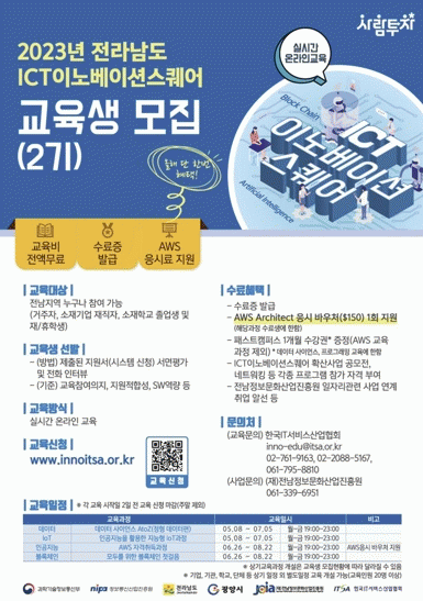 교육비는 전액 무료이고 전남도민이면 누구나 전남ICT이노베이션스퀘어 누리집을 통해 신청할 수 있다.