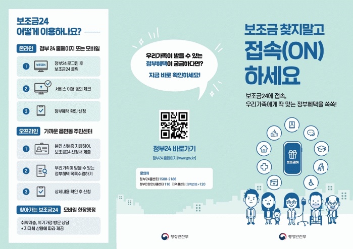 온라인 이용은 정부24 로그인 후 보조금24 이용 동의를 거치면 본인과 14세 미만 자녀가 받을 혜택을 조회할 수 있다.