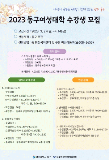 올해 동구 여성대학 개설 강좌는 ▲취미(스트레스 팡팡! 동구 노래교실) ▲인문(재미있는 글쓰기·반려동물 수제 간식 만들기·나도 맥가이버 집수리 교육) ▲바로 일자리 갖기(호텔 객실 관리사·정리수납 전문가 2급) 등 3개 분야 6개 과정이다.