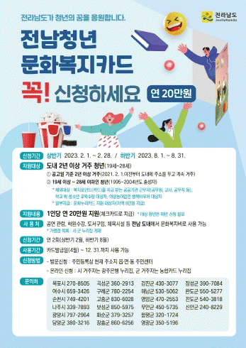 전남청년 문화복지카드 지원사업은 도내 청년들에게 연 20만 원의 문화복지비를 체크카드 포인트 형태로 지원하는 사업이다.