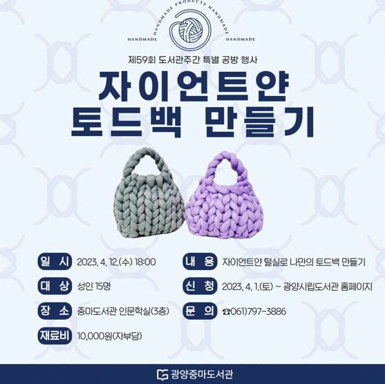 광양시민 성인 15명을 대상으로 자이언트얀 공예의 기초를 배워보고 직접 가방을 만들어보는 활동으로 진행되며, 재료비는 1만원이다.