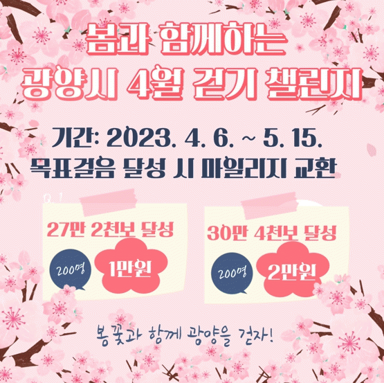 서영옥 건강증진과장은 “따뜻한 봄을 맞아 워크온 챌린지를 추진해 시민들의 생활 속 걷기를 장려함으로써 건강을 지키기 위한 꾸준한 걷기 습관 정착으로 지역사회 건강한 걷기 문화가 조성되길 바란다”고 말했다.