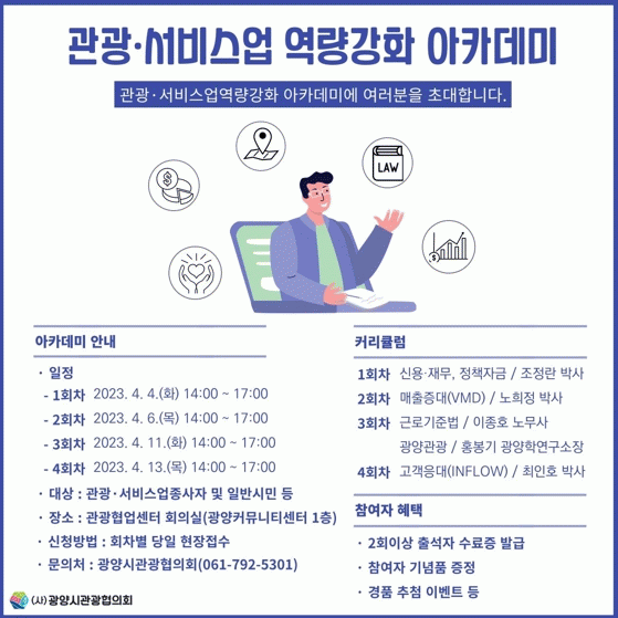 시는 오는 4일부터 관광협업센터 회의실에서 광양시관광협의회 주관으로 ‘관광·서비스업 역량강화 아카데미’를 개최한다고 밝혔다.