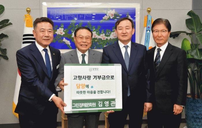 담양군에 따르면 이날 김영관 회장의 고향사랑기부금 기탁식에는 최용만 군의회 의장과 대전면 출신의 그린장례문화원 이기헌 사장이 함께했다.