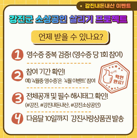참여는 ① 강진군 소상공인업체 이용시 사진찍기 ② '1만 원 이상 영수증' 수령 ③ 개인 SNS 전체공개 게시(필수 해시태그 포함 게시 : #강진, #강진내돈내산, #강진소상공인) ④ 이벤트 신청 순으로 참여하면 된다.