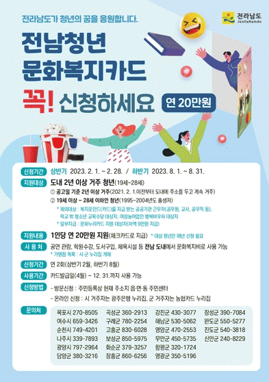 ‘전남청년 문화복지카드 지원사업’은 전라남도 내 거주하는 청년의 문화생활 향유 및 자기계발 기회를 제공하기 위해 문화복지비 연 20만 원을 지원하는 사업이다.
