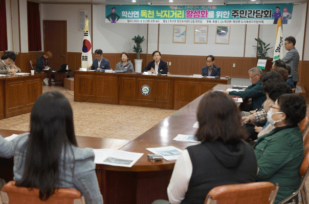 두 시간에 걸쳐 진행된 간담회에서는 독천 낙지음식명소거리 활성화를 위해 설치됐으나 지금은 지역주민과 상인들의 갈등을 유발하고 있는 구조물 철거에 관한 사전 여론조사 결과를 발표하고 독천 낙지거리와 학산면 소재지 활성화 방안에 대한 다양한 의견이 논의됐다.