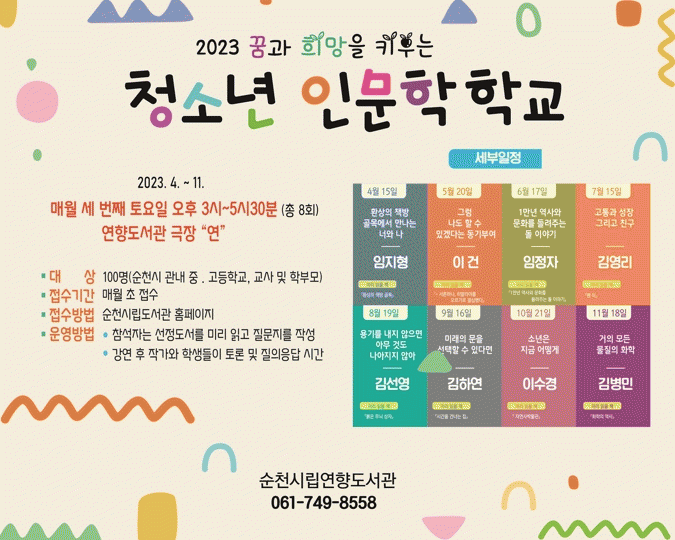 청소년 인문학학교는 청소년 누구나 참여할 수 있으며, 자세한 사항은 순천시립도서관 누리집을 확인하거나 순천시립연향도서관으로 문의하면 된다.