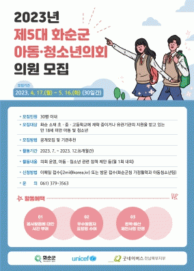 아동·청소년의회는 모집 후 ‘제5대 화순군 아동·청소년의회’를 구성하고 7월 위촉식을 시작으로 의장단선출 및 상임위원회 활동 등으로 진행하며 임기는 2023년 12월까지 활동하게 된다.
