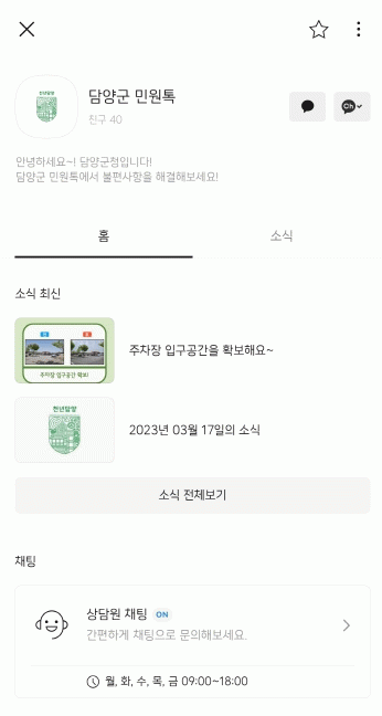 그동안 국민신문고와 담양군 누리집, 전화, 방문 등으로 생활불편 민원을 접수해왔으나, 군민과의 소통을 더욱 늘리기 위해 지난 11일부터 카카오톡 채널 담양군 민원톡을 통해 현장의 생활민원을 접수 처리하고 있다.