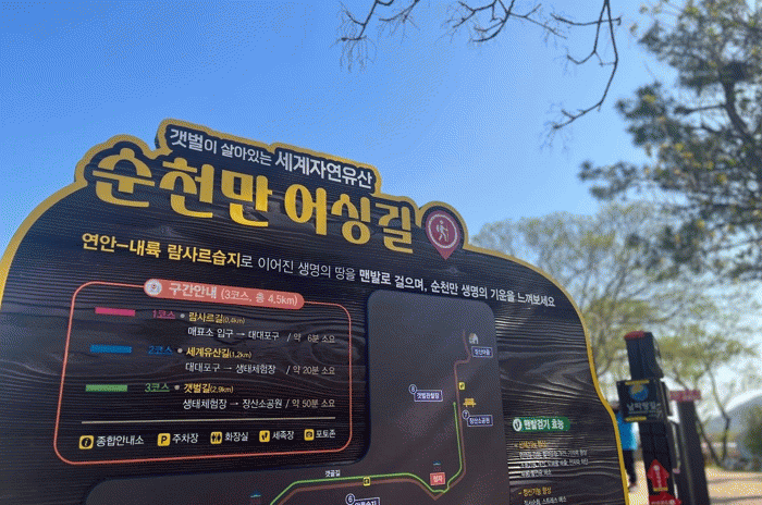 순천만습지에는 람사르길(0.4km), 세계유산길(1.2km), 갯벌길(2.9km)까지 약 5km의 어싱길(Earthing trail) 코스가 마련되어 있다.