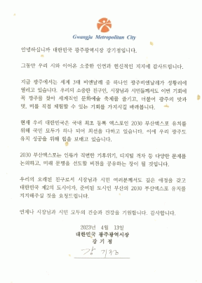 강 시장은 서한문을 통해 “2030부산엑스포는 인류가 직면한 기후위기, 디지털 격차 등 다양한 문제를 논의하고, 미래 문명을 선도할 비전을 공유하는 장이 될 것이다”며 “대한민국 제2의 도시이자, 준비된 도시인 부산의 2030부산엑스포 유치를 지지해줄 것을 요청드린다”고 밝혔다.