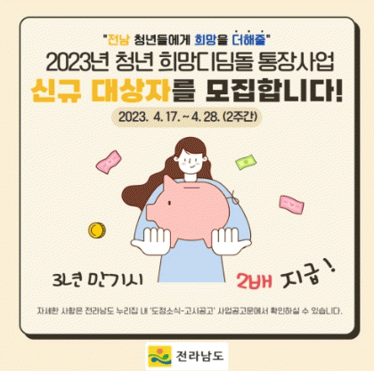 정광선 전남도 인구청년정책관은 “청년 희망디딤돌 통장이 사회에 진출한 청년의 경제적 어려움을 조금이나마 덜고 자립하는 기반이 되길 바란다”며 “지역에서 많은 청년이 성실하게 저축하고 주거·결혼·창업 등 미래계획을 세우도록 다양한 청년 지원시책을 발굴하겠다”고 말했다.