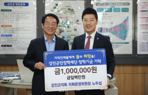 강진군민장학재단 이사장 강진원 강진군수는 “의정과 군정에 이어 학생들의 학업까지 살펴 도와주시는 마음에 감사드린다”며 “아름다운 마음이 전해지도록, 기탁금은 소중하고 투명하게 사용하도록 하겠다”라고 전했다.