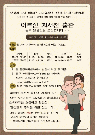 참가 자격은 동구에서 장기 거주한 만 60세 이상 어르신 중 자서전 집필 경험이 없는 분이면 된다. 각 동 행정복지센터에 비치된 신청서를 작성해 동 행정복지센터 또는 이메일로 접수하면 된다.