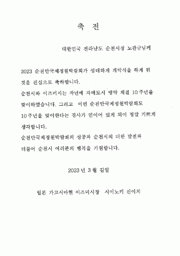 순천시의 자매도시인 일본 이즈미시 시장(시이노키 신이치)은 “10년 만에 다시 개최되는 순천만국제정원박람회를 진심으로 축하한다”라며 자매도시로써 정원박람회 성공 개최를 염원하는 서한문을 순천시에 보내왔다.