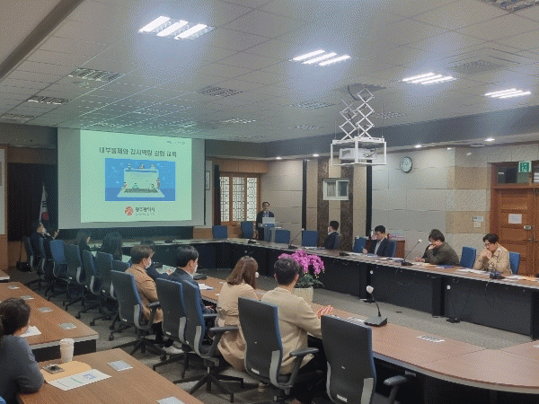이날 연수는 광주시 감사위원회 임대진 감사2팀장을 초빙해 ‘내부통제와 감사역량 강화’라는 주제로 펼쳐졌다. 작년부터 감사원 심사평가 항목에 추가된 내부통제 시스템에 관한 내용을 포함해 문답서 작성 방법 등 감사기법에 대한 전반적인 내용을 다뤘다.