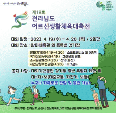 한편, 순천시는 2023순천만국제정원박람회의 성공 개최 및 지역경제 활성화를 위해 제18회 전남어르신생활체육대축전을 시작으로 9월 2023전남장애인생활체육대회, 10월 제35회 전남생활체육대축전 등 3개 생활체육대회를 개최한다.
