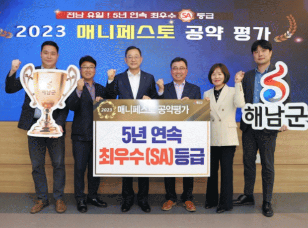 5년 연속 최우수(SA) 등급은 전남도내 유일한 결과로, 해남군은 민선7기 4년 연속 최우수(SA)에 이어 민선8기 들어 첫 평가에서도 최우수를 획득하면서 최고의 성적을 이어가고 있다.