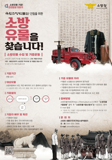소방유물 수집·기증 운동은 2025년 개관을 목표로 건립 중인 국립소방박물관에 우리나라 소방의 역사를 보여주는 근대 개항(1876년) 이후 1980년대까지 곳곳에 숨겨진 소방에 관련된 역사자료와 소방유물을 수집하기 위해 마련됐다.