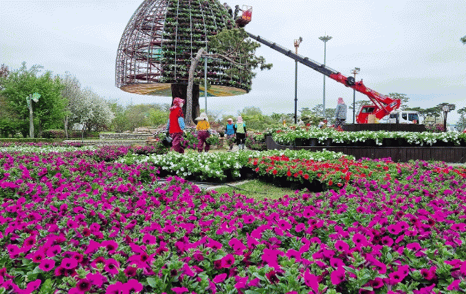 이번 작업에는 웨이브 사피니아 화분 4,500개가 소요됐으며, 관광정책실 직원을 비롯해 공공일자리 참여자 등 50여 명과 크레인 등의 장비가 동원됐다.